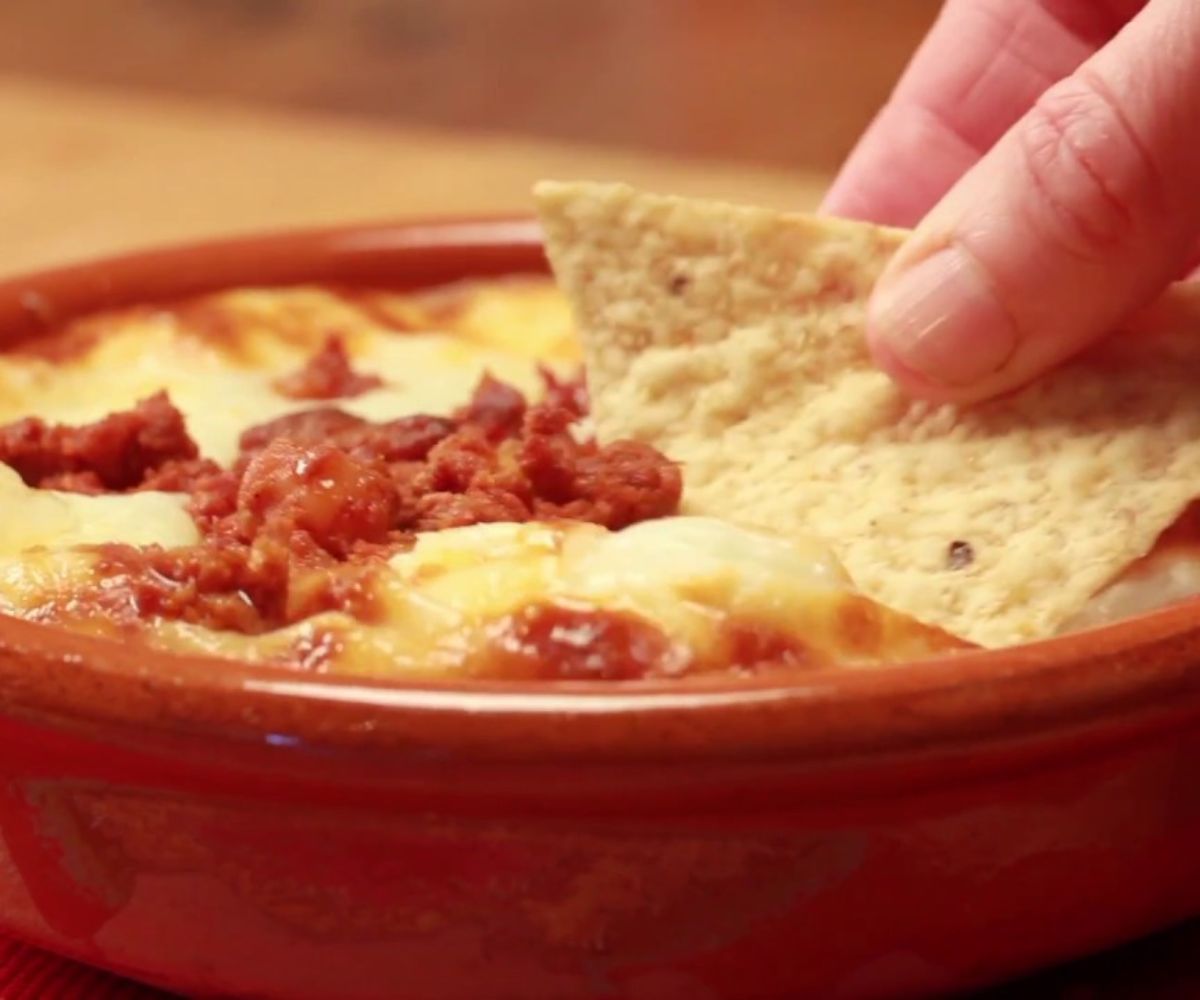 FUNDIDO DE QUESO CON PULLED PORK EN CAZUELA CON UN TOQUE DE CEBOLLA ENCURTIDA Y PEREJIL FRESCO PARA PREPARARTE TUS PROPIOS TACOS, ACOMPAÑADO DE 4 TORTILLAS DE TRIGO.